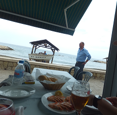 ロンダのワイン。車上荒らしに遭ってヤケクソになっているのか、少し高めの20€のボトルワインを注文。ここでのんびりとお神輿を待つっていうプランだそうです。ロンダのおいしい白ワインを賞味したければ、これ、おススメ(親談)。