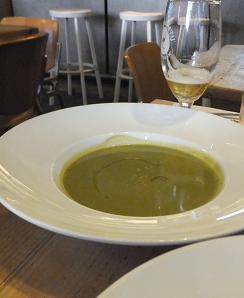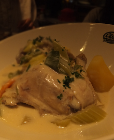 ワーテルゾーイ(waterzooï)っていうんだって。鶏肉とホワイト・ソース。子供にも食べやすい味だわ~。でも、親は「うーん、鶏肉がギュッとしまってかたくなっちゃってるなぁ…。ソースも濃厚ではなく意外にさっぱり味…。これで23.55€か…。」