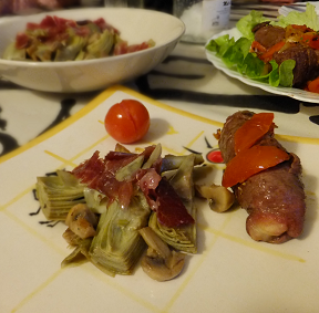 (アーティチョークと生ハムのマリネ:妻作 ※右は別料理:ポテトの牛肉巻き)