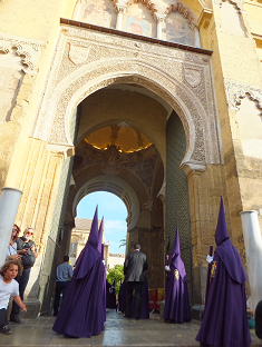 おー、やっぱりセマナサンタ(聖週間)中。ロンダでみたのと同じとんがり帽子の人たちが練り歩いています。