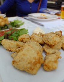 あー、お腹が空いた。今日の昼食はこちら。スペイン風鳥のから揚げ(6€)。ほかにもう一品、タラのフライを食べたけど、そっちもおいしかったよ。上品な揚げ物が食べたければ、ココ、おススメ。