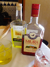 注文もしていないのに、フルーツのリキュールがでてきたぞ~!この店を紹介してくれたスペイン人の友人が粋な計らいをしてくれたようです…。アタシには関係ないんだけど…。親は大感激。ソブレメサ(sobremesa)とシャレこんでます…。ちなみに、ソブレメサっていうのは、スペインの食習慣の一つで、食後の時間を、このようなお酒を飲みながら、ゆっくりとおしゃべりを楽しむことなんです。