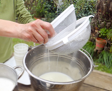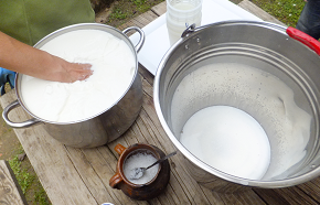 今朝搾ったミルクに塩と凝固剤(写真右)を少々。