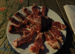 さて、今日の労働はこれにて終了。おうちに帰って晩ご飯です。宿にあった釜戸でバーベキューだっ!すると、ローラさん、素晴らしい情報を教えてくれました。車ですこし行ったところにおいしいお肉屋があるそうな。そこで、「イベリコ豚のセクレート(secreto)とプルーマ(pluma)という部位をぜひ購入せよ」とのこと…。これはいい情報をもらったぞ!!