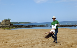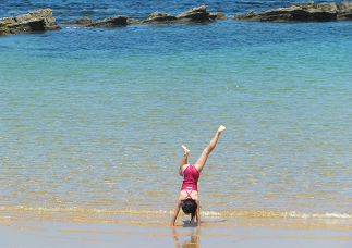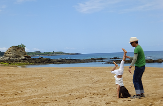 次の日は晴天!ビーチに出て、とりあえずは得意の逆立ち…