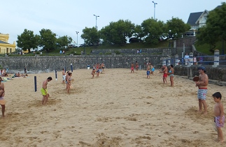 みんな、ビーチでテニス。スペイン人は、このビーチでのテニスがほんとに好きみたい。子どもからお年寄りまで、みんな楽しんでます。まさにスペインのビーチ公式スポーツ。