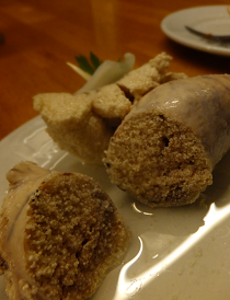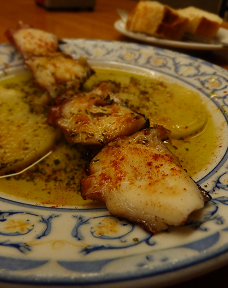 なにこのおもしろい注ぎ方!?これ、チャコリ(txakoli/chacoli)っていうバスク地方のワインなんだって。発泡性の白ワインを、こうやって高い位置から注いで、炭酸を思う存分遊ばせて飲むそうな…。じょわじょわ~。冷えてるから、ビールの代わりに、一杯目からでもOK、って、親が言ってます。ちなみに、一杯目を注いだ時に「あー、写真撮り忘れた」って言ったら、もう一杯ついでくれちゃった、タダで…。気の利いたサービスがうれしい。