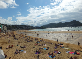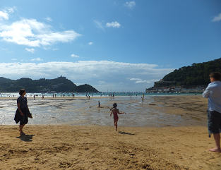ビルバオをバスで出て、2時間弱でサンセバスティアンへ到着で~す。実はここ、2度目の滞在なの。以前は、入院した知り合いのお見舞いにやってきたことがあるんだ。その時は、11月で、まだ泳ぐには早かったけど…。今回はばっちりビーチで楽しむぞ!!4泊もするし…。その美しさに、人はここを「ビスケー湾の真珠」とか「スペイン北部の至宝」とかって呼びます。ステキなネーミング。ちなみにここはバスク州。バスク語ではサンセバスティアンはドノスティア(Donostia)。人たちはバスク語も話すの。もちろんスペイン語も通じるけど、とりあえず「ありがとう」だけ覚えとこっと。エスケリク・アスコ(Eskerrik asko)か…。