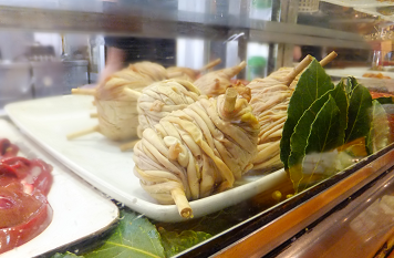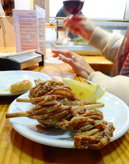 このケッタイな形をした食材。その名をサラホス(zarajos)というクエンカ(Cuenca)の名物タパス。植物(主にぶどう)のつるを交差させ、そこへ子羊の小腸をぐるぐると巻きつけているため、このような状態になっています。1個3.00€。これを調理してもらうと、次の写真のようになります。