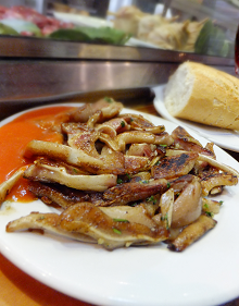 この店では、このブログでも紹介したモジェーハス(mollejas:子羊のリンパ)や、その他、定番の臓物料理のカジョス(callos:胃袋の煮込み)やリニョネス(riñones:レバー)なども賞味できます。店頭のケースには、オレーハス(orejas:豚の耳)もっ!!勢いで頼んでみました。